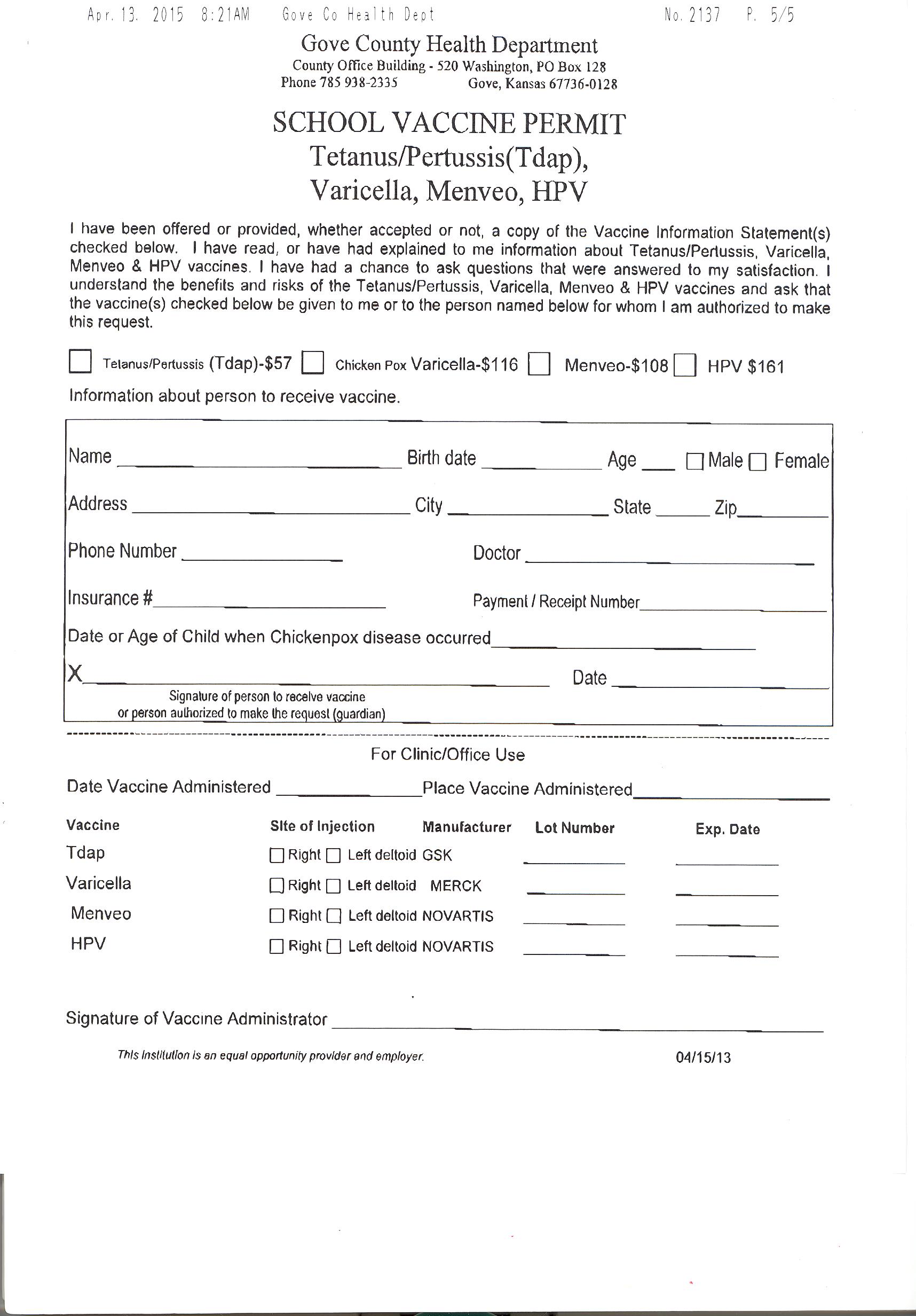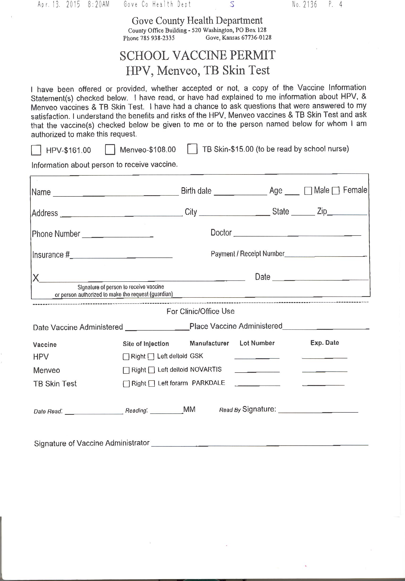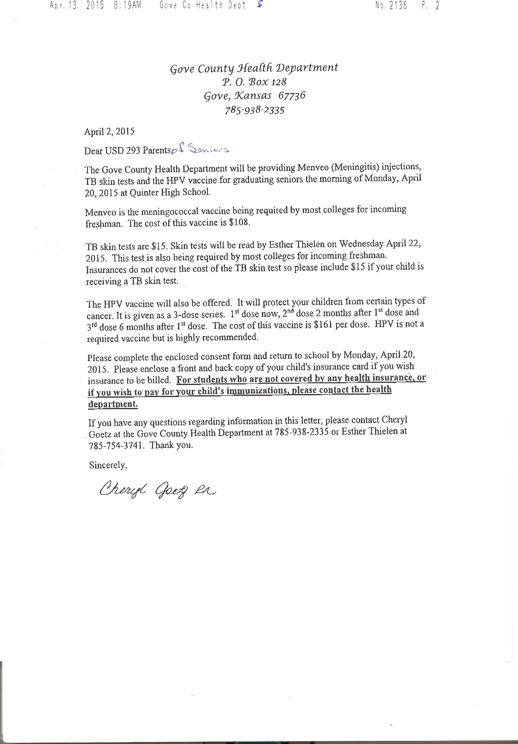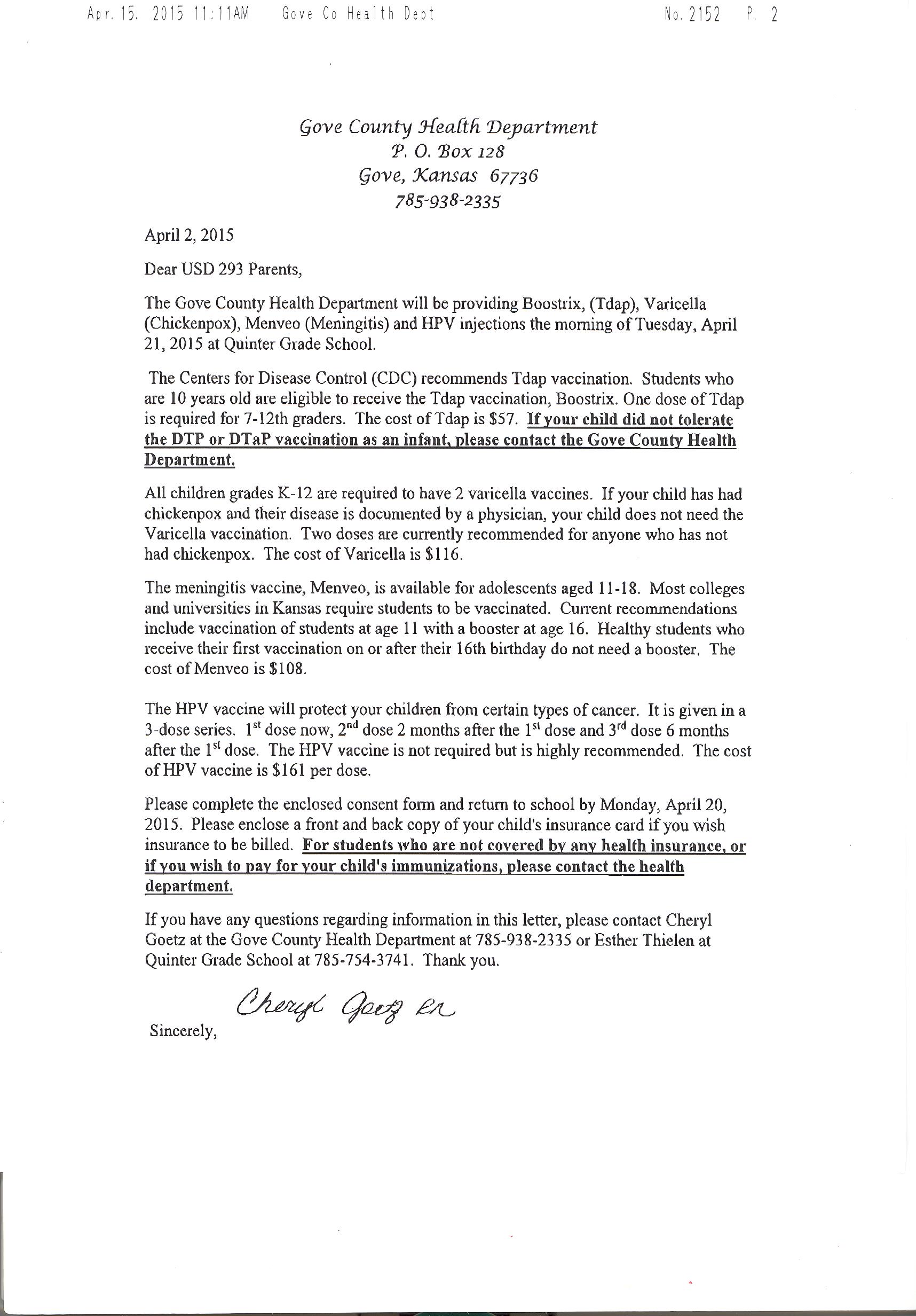 The Gove County Health Department will be offering immunizations for students the week of April 20. Please see the letters below for more information as well as consent forms and details on the immunizations being provided.